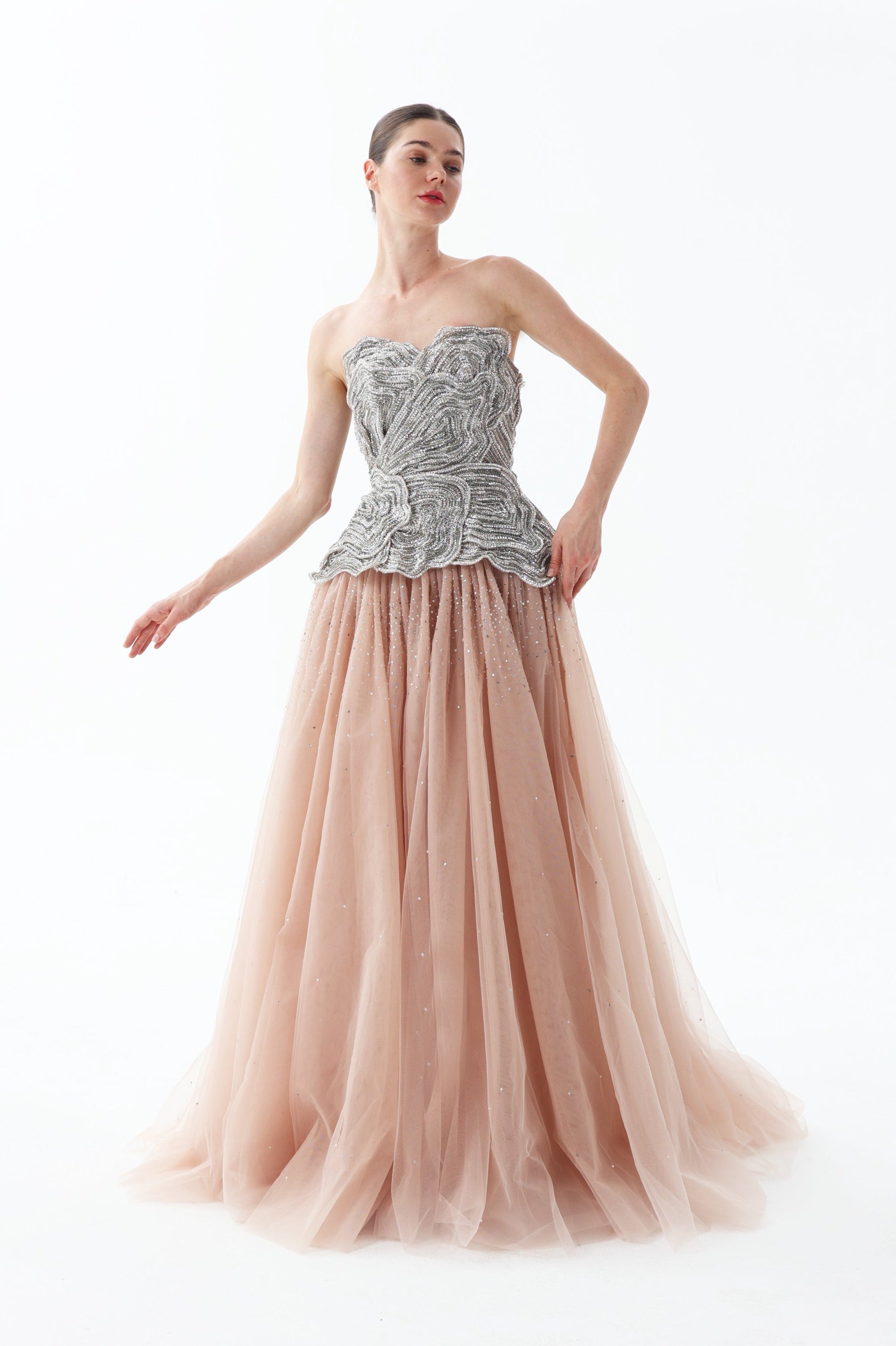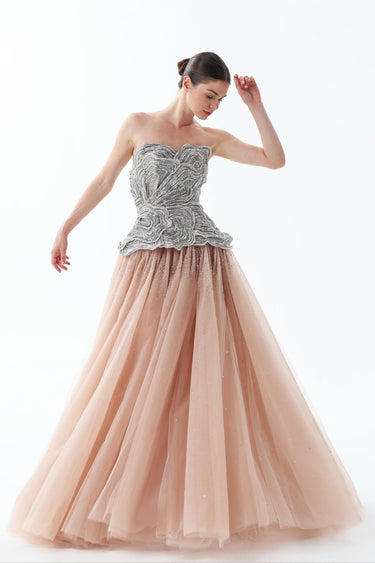 A symphony of sparkle and softness. Our wrapped petal couture gown features a meticulously crafted jewel-encrusted bodice that complements and contrasts the ethereal flow of its romantic tulle skirt.