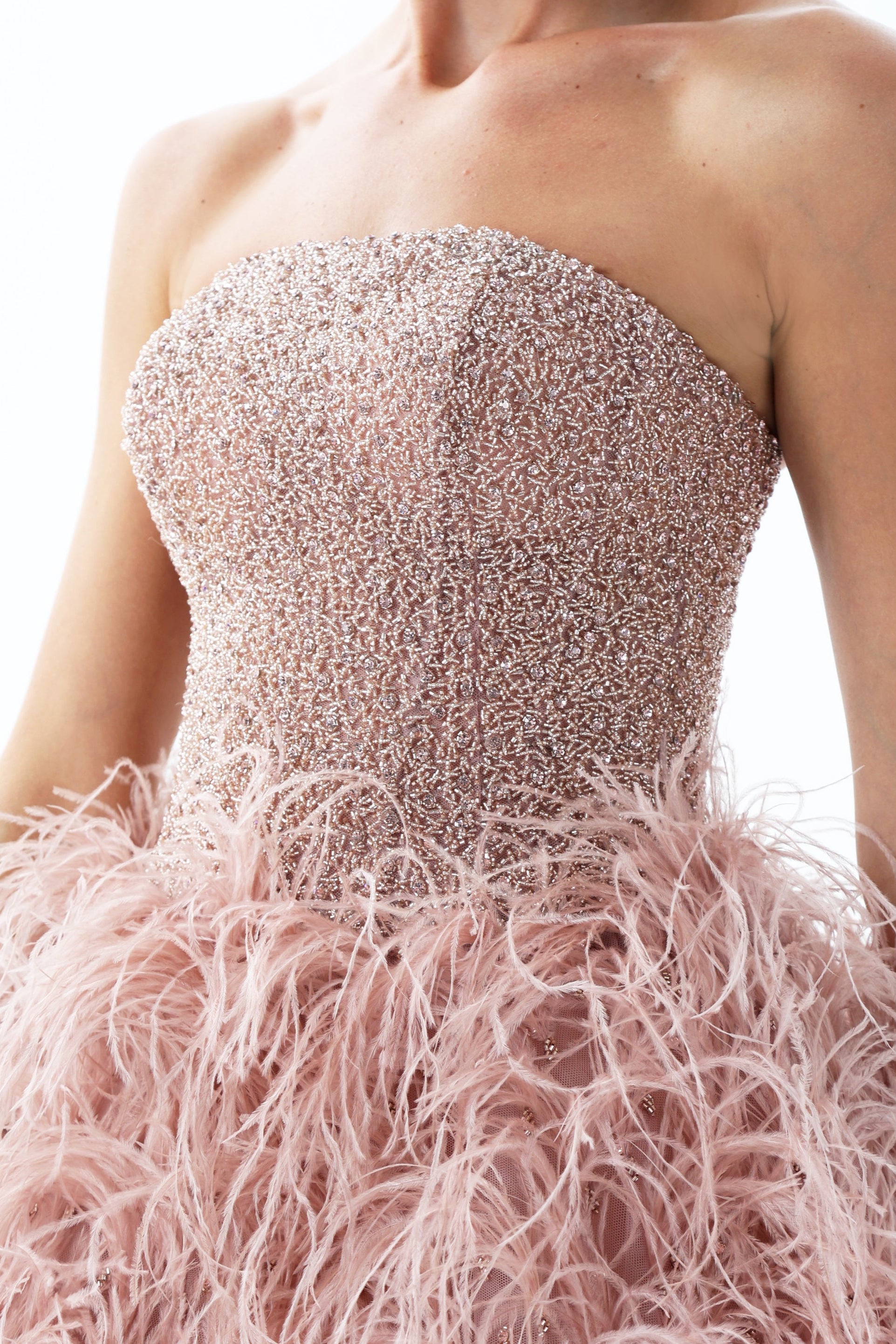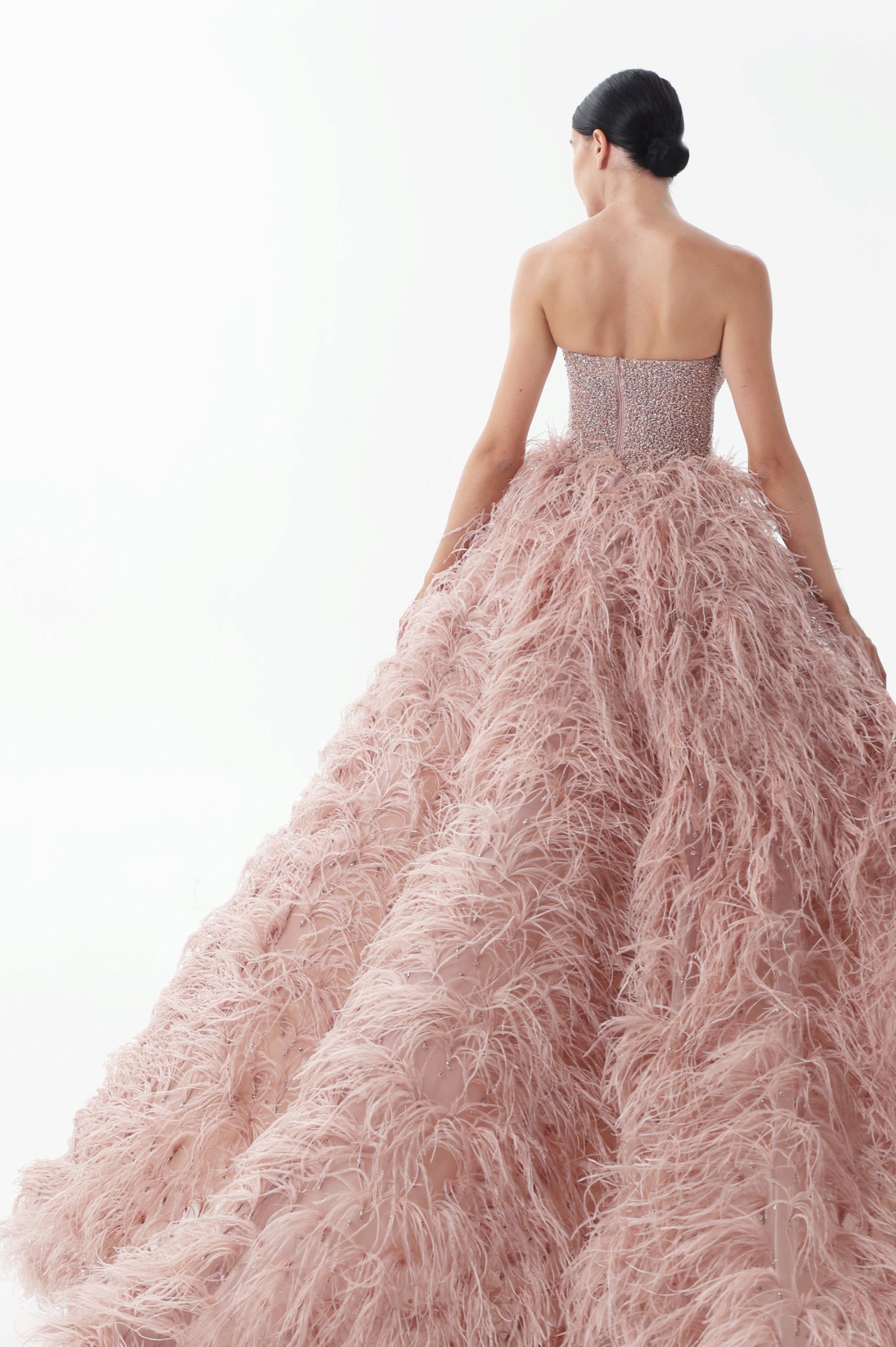 Grab the spotlight and let your inner queen shine in this enchanting creation! With a Swarovski and beaded hand-embroidered bodice, the dress shimmers and radiates with every movement. The hand-made feather skirt cascades in a whimsical dance, embodying grace and sophistication. Each intricate detail is a testament to the countless hours of true craftsmanship by our artisans.