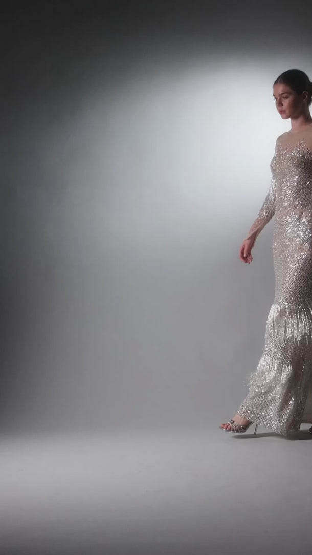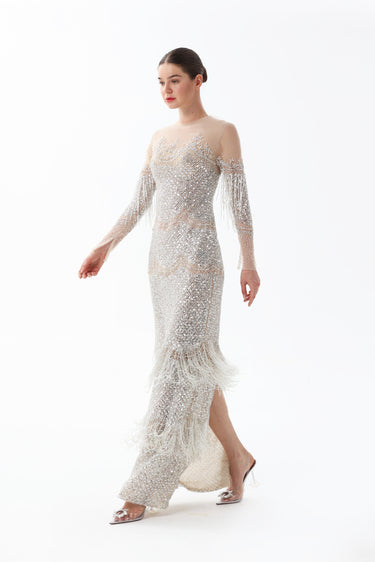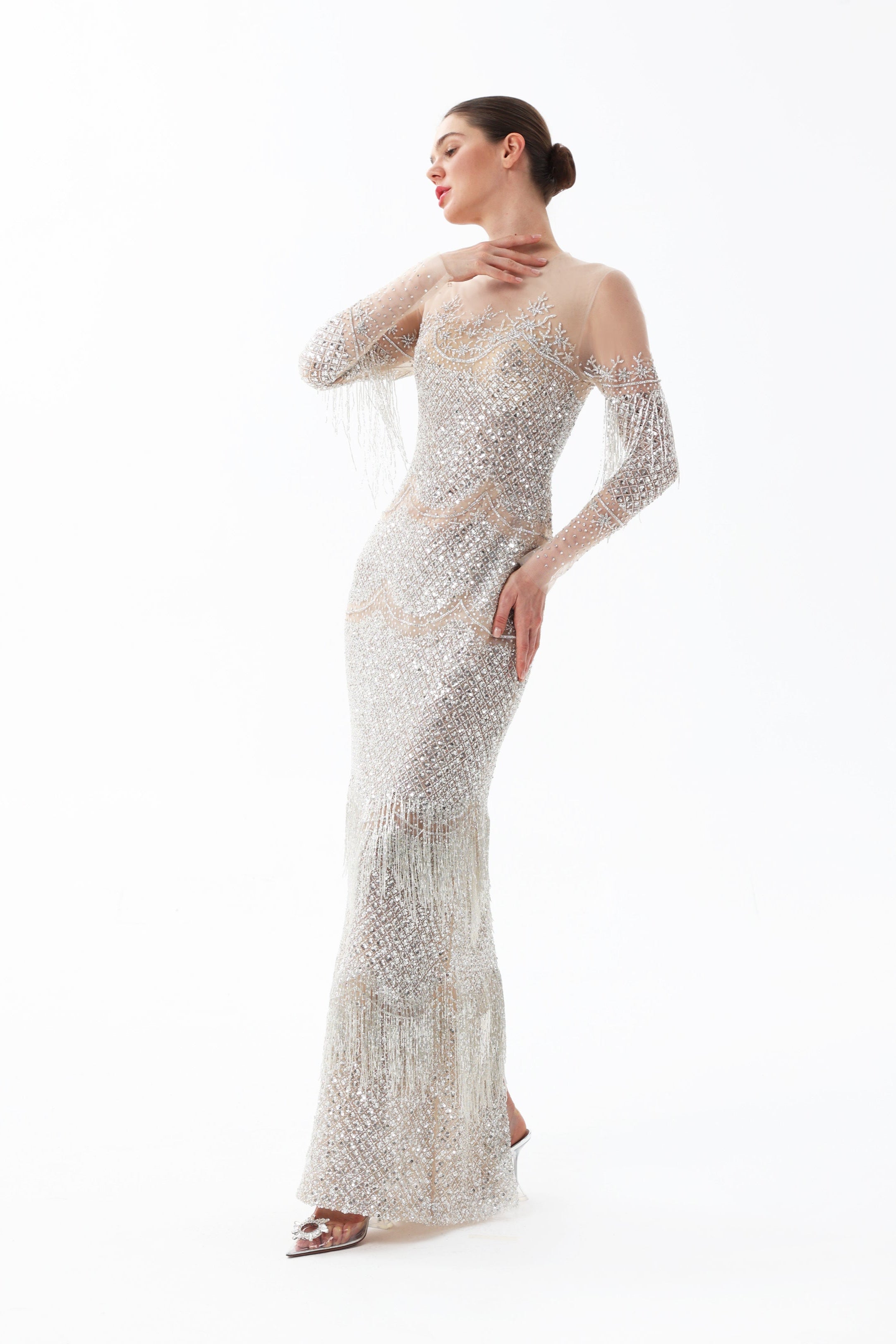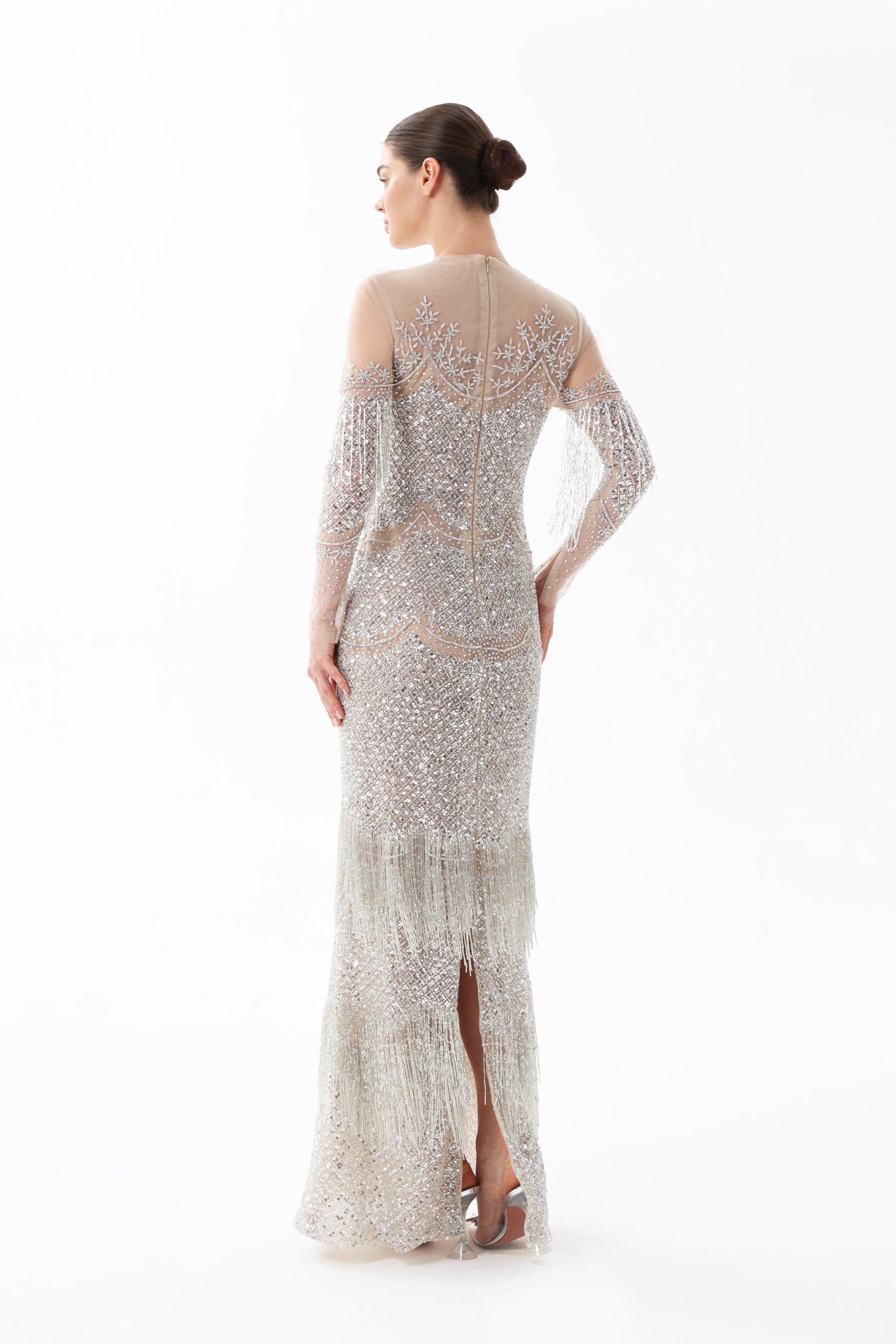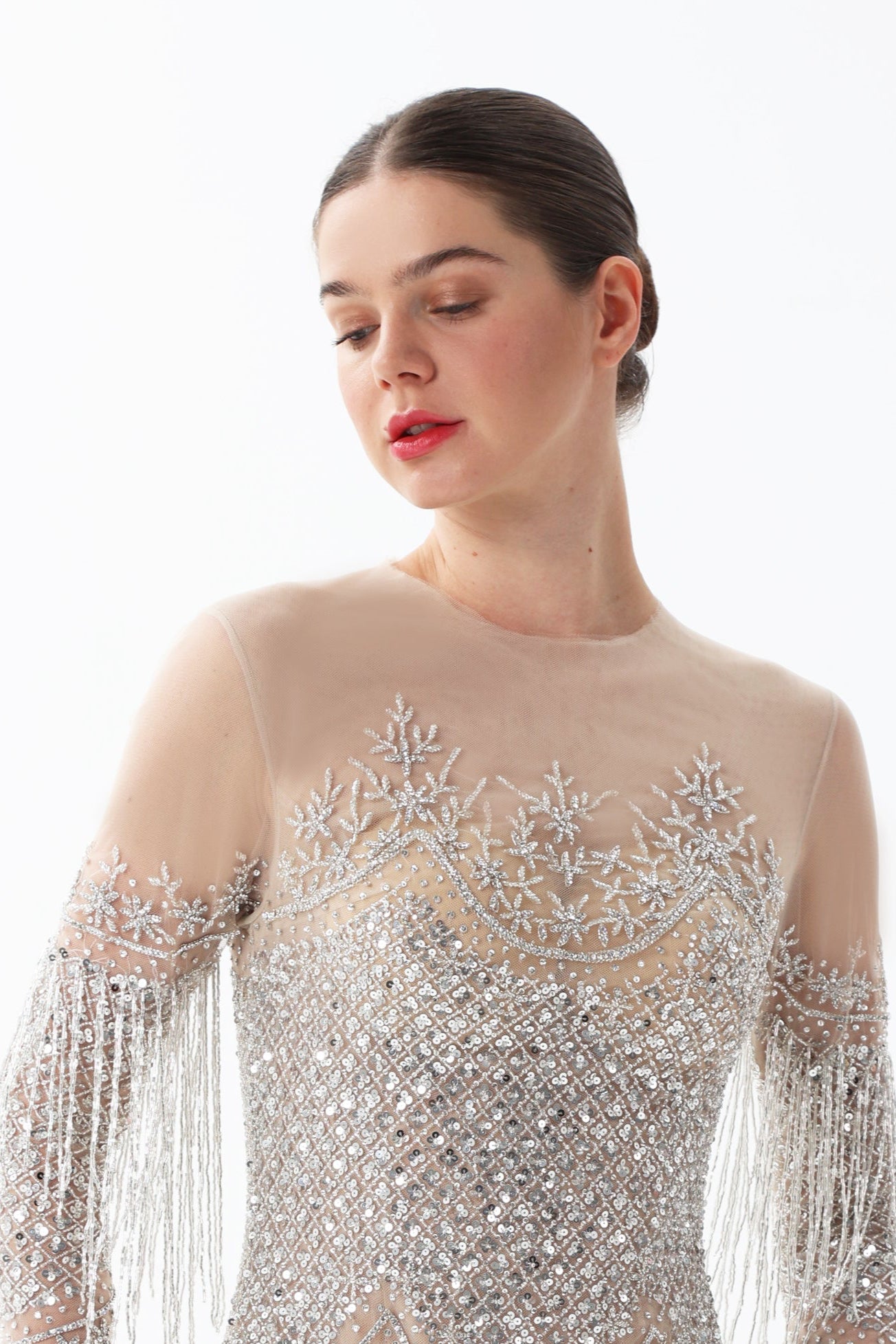 A captivating blend of artistry and playfulness. This hand-embroidered dress features intricate patterns adorned with delicate tassels that sway gracefully with every step, creating a mesmerizing dance of movement.