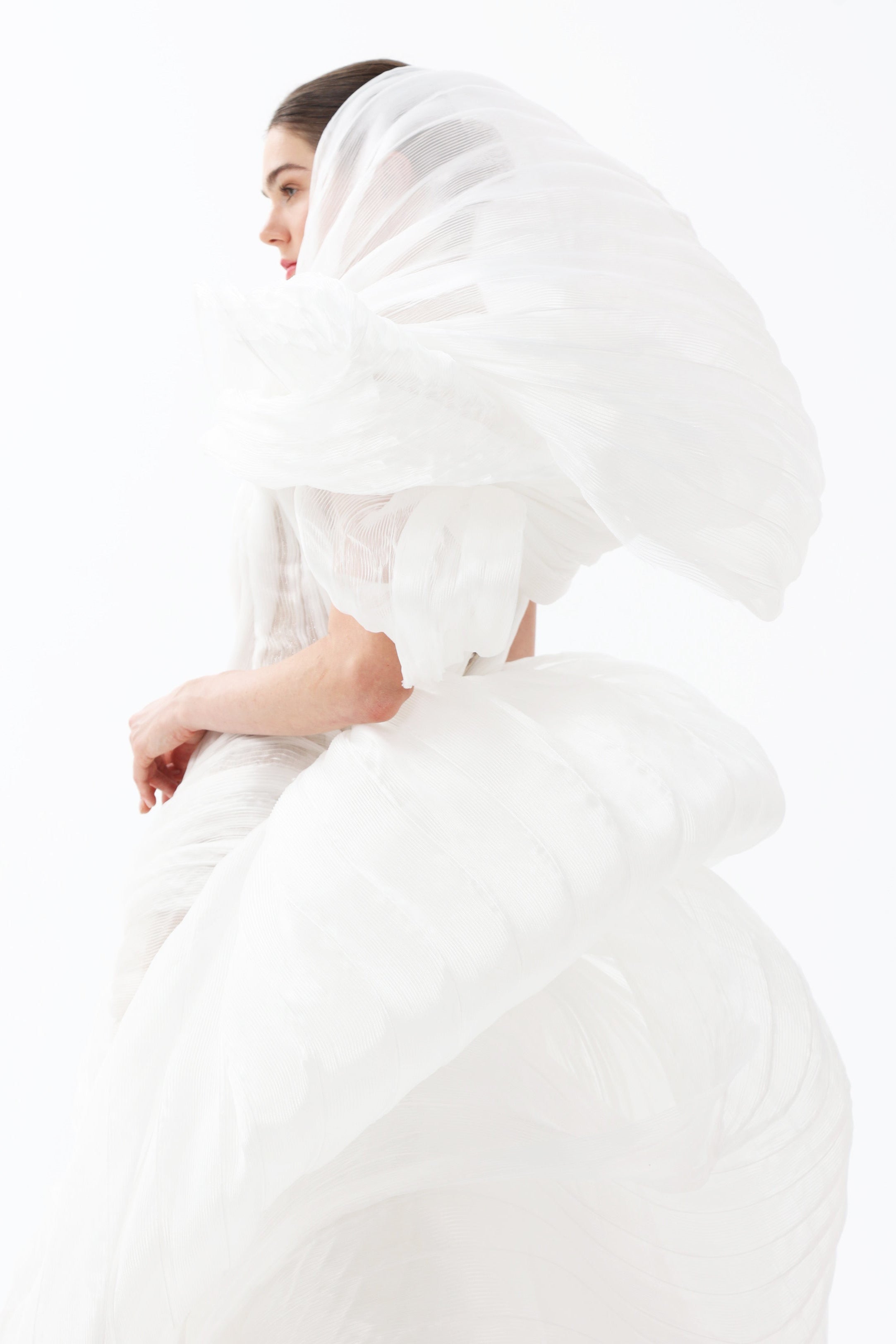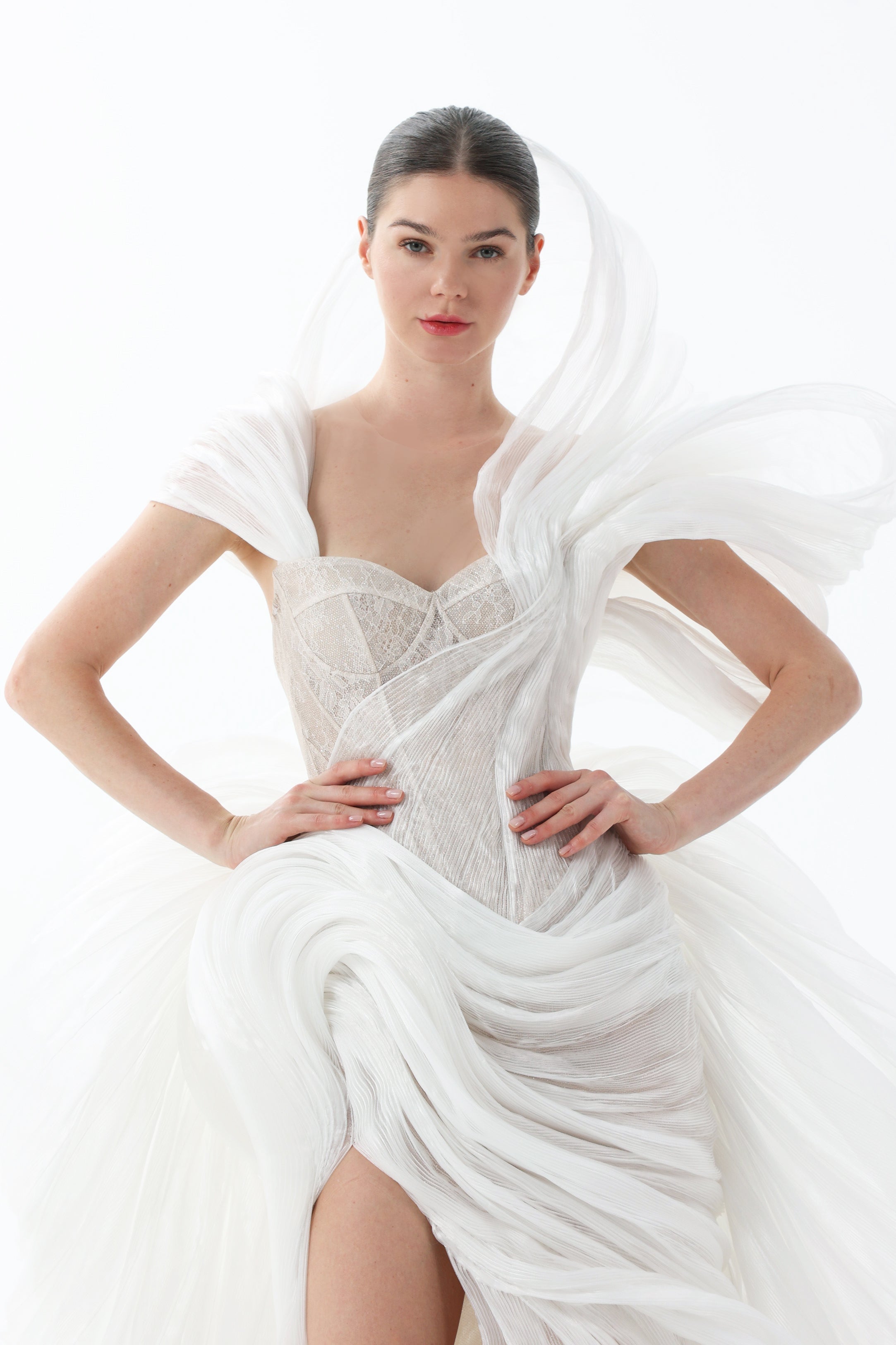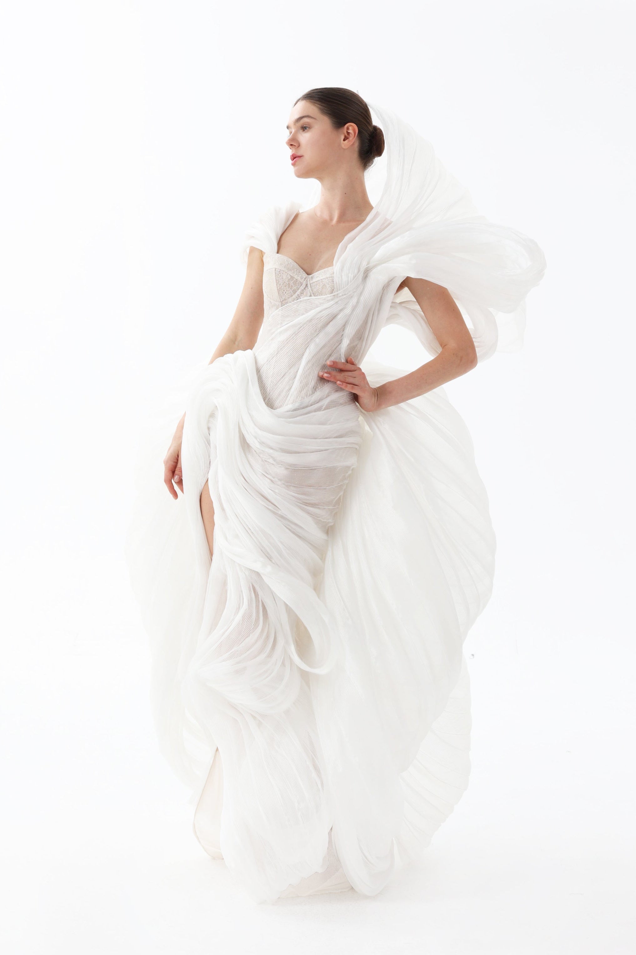 Make a statement with this perfect combination of glamour and innovation. The shimmering bodice and structured organza design create a truly eye-catching ensemble.